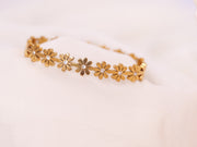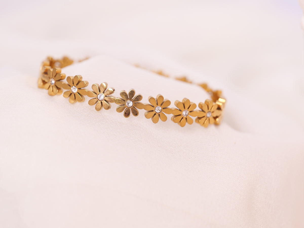 Delicately crafted with daisy-shaped motifs, this stunning gold bracelet embodies timeless charm and femininity. Each flower is accented with a sparkling stone at its center, adding a subtle touch of radiance. Perfect for both everyday wear and special occasions, this bracelet is a beautiful expression of grace and style.