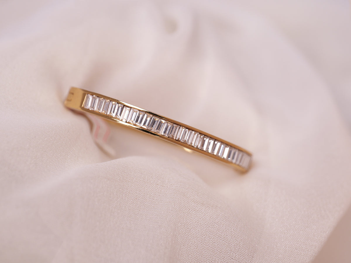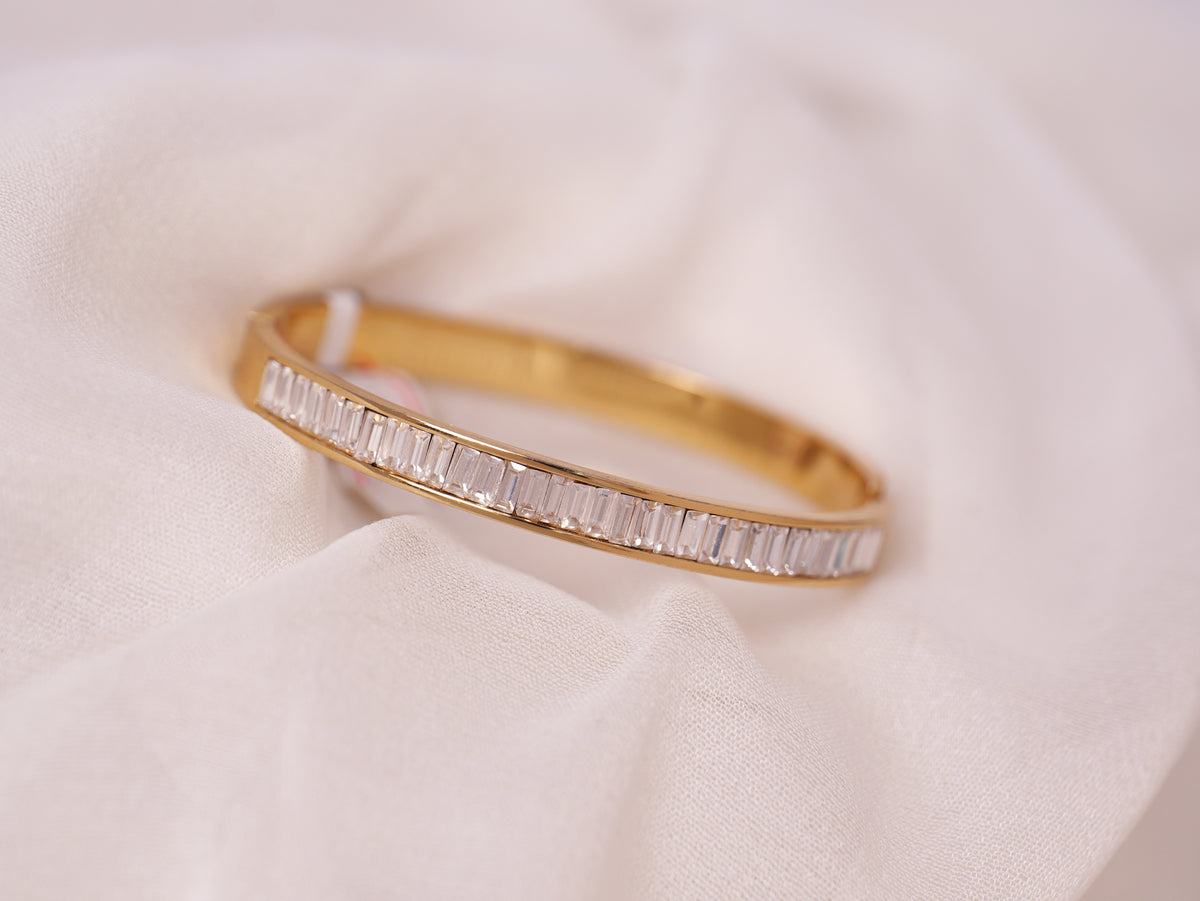 Refined and radiant, this elegant gold bracelet features a flawless row of baguette-cut stones that exude timeless sophistication. The sleek, minimal design highlights the brilliance of each stone, creating a luxurious sparkle perfect for any occasion.