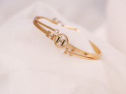 Chic and sophisticated, this gold cuff bracelet features a sleek double-band design centered with a bold circular emblem. Accented by a single sparkling crystal, it embodies effortless elegance and modern style. Perfect for making a refined statement whether worn alone or layered with other pieces.