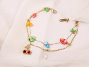 Add a fun and playful vibe to your look with the Color Pop Charm Chain Bracelet. Designed with a mix of vibrant multicolored beads and a cute cherry charm, this bracelet brings a touch of cheerful charm to any outfit. Its dual-layer gold chain and delicate detailing make it the perfect accessory for both casual and trendy styles.