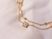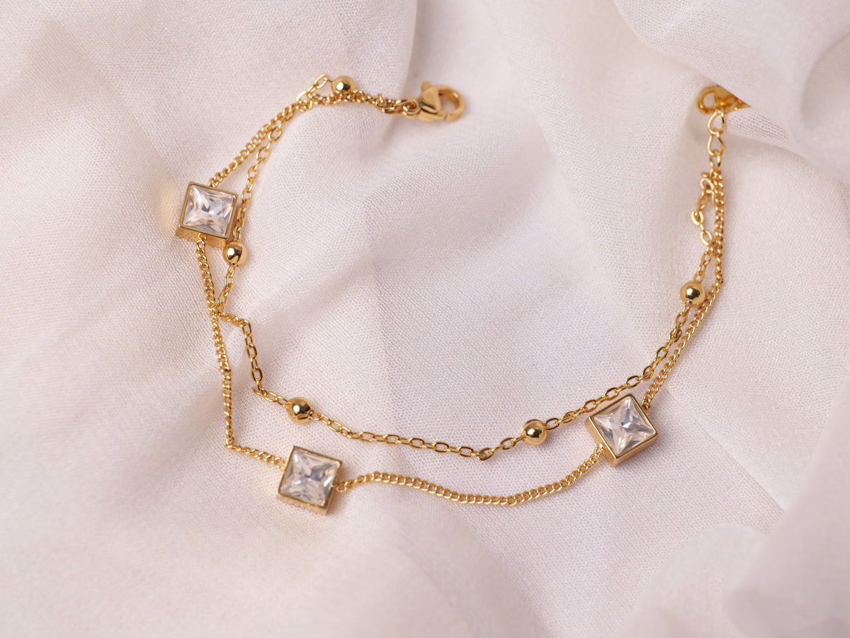 Refined and radiant, the Duo Layer Crystal Chain Bracelet adds a touch of understated luxury to any look. Designed with two delicate gold chains — one featuring polished beads and the other square-cut crystal charms — this bracelet perfectly balances minimalism with sparkle. Ideal for everyday wear or evening elegance, it pairs beautifully with both modern and classic styles.