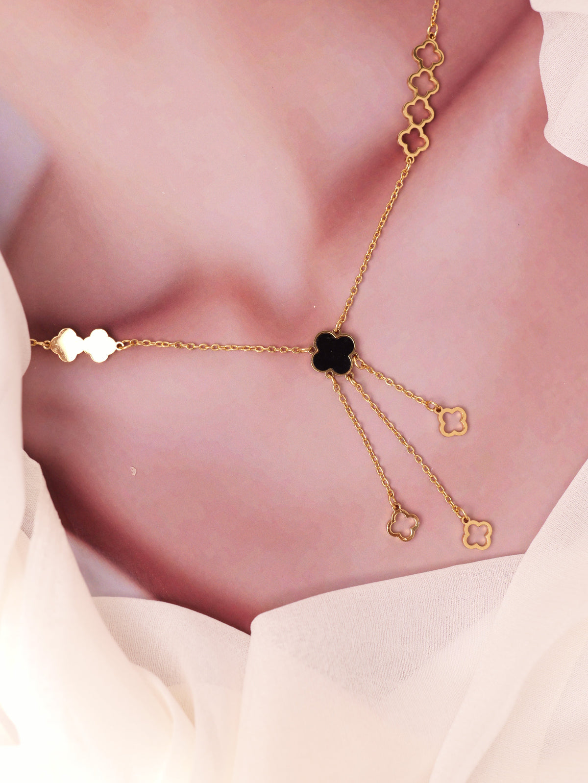 Delicate and refined, this clover charm necklace brings a touch of modern grace to timeless elegance. Featuring multiple clover motifs and a layered drop design, it symbolizes luck and beauty while adding sophistication to any ensemble.
