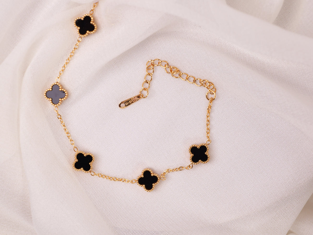 Sophisticated and timeless, the Black Clover Charm Bracelet is a must-have piece for any jewelry collection. Designed with a delicate gold chain and five black enamel clover charms, this bracelet exudes elegance and versatility. Its classic design makes it perfect for both daily wear and special occasions, adding a refined touch to any outfit.